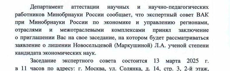 14 ноября 2024 года должно было состояться очередное заседание ВАК. Вот только Новосельцева снова не явилась, предоставив справку, что она снова уехала в командировку, чтобы восстанавливать технику.