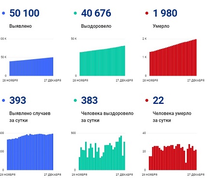 По данным регионального управления Роспотребнадзора на утро 27 декабря общее число заболевших в регионе составило 50 100. За последние сутки выявлено 393 новых случаев инфицирования COVID-19.